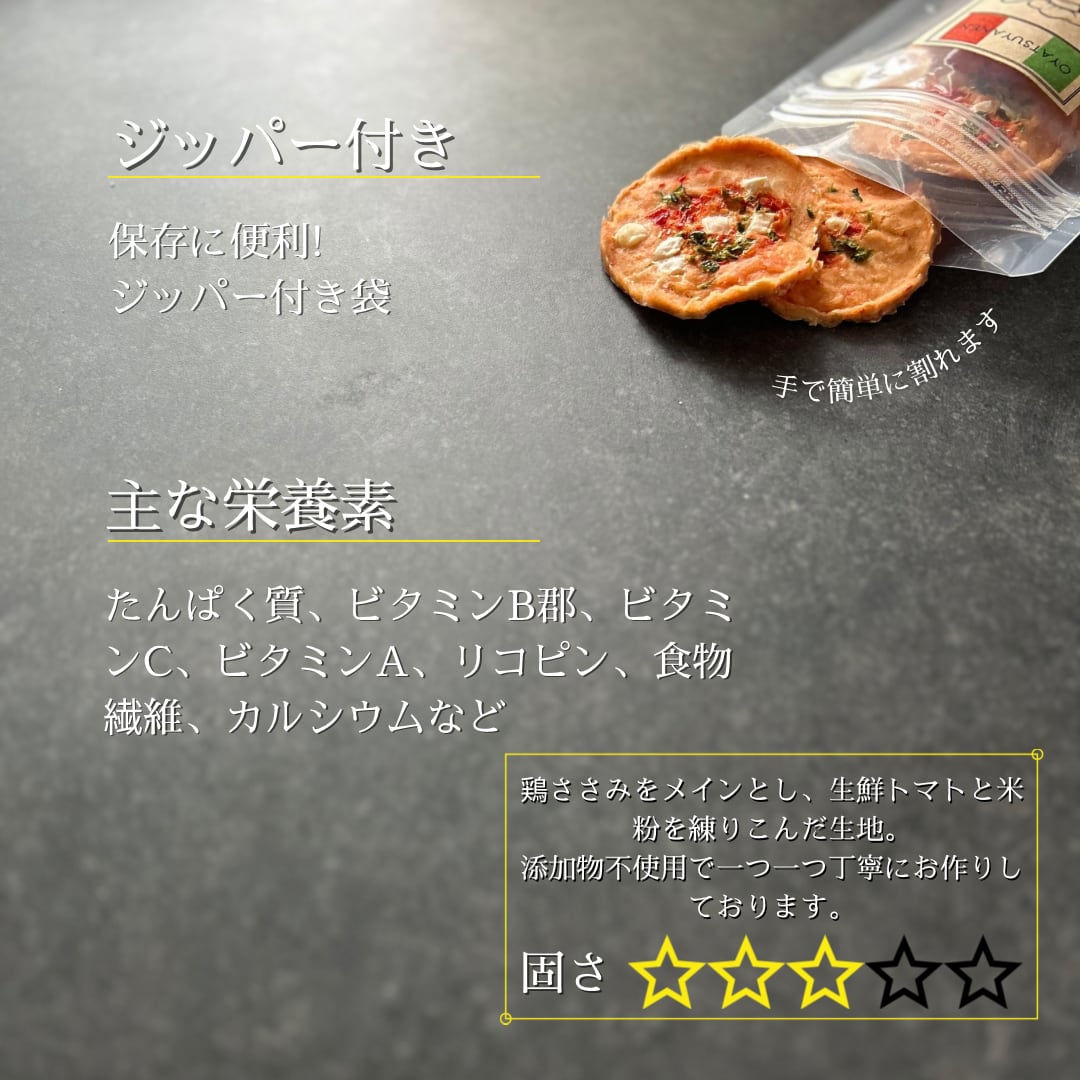 ・原材料名 鶏ささみ(福岡県産)、米粉、トマト、パプリカ、ピーマン、ナチュラルチーズ(すべて国産)